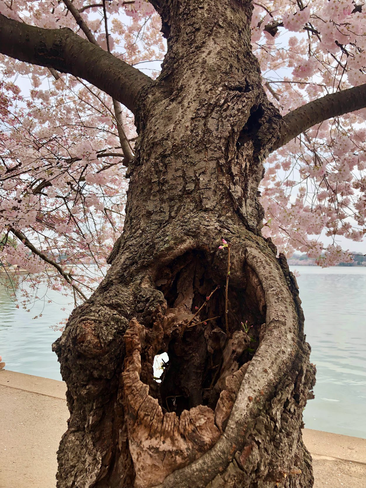 In the Spring of 2023, I got to see the cherry blossoms bloom in DC for the first time. I took so many pictures and I knew my mom would want to see them too. We love looking at old, twisted, and beautiful trees together. One tree specifically, or rather the stump that was left of it, caught my eye. Where the tree was cut, the hollow core of the stump made the perfect shape of a heart, and it was full of green grass and clovers. It instantly reminded me of when my mom came to Richmond for my VCU graduation two years earlier, when she pointed out a tree that had two heart shaped marks on it where its branches had just been sawn off. The next day, when we were dressed up for graduation photos, we made sure to pose with that tree- our hands on each of the hearts.