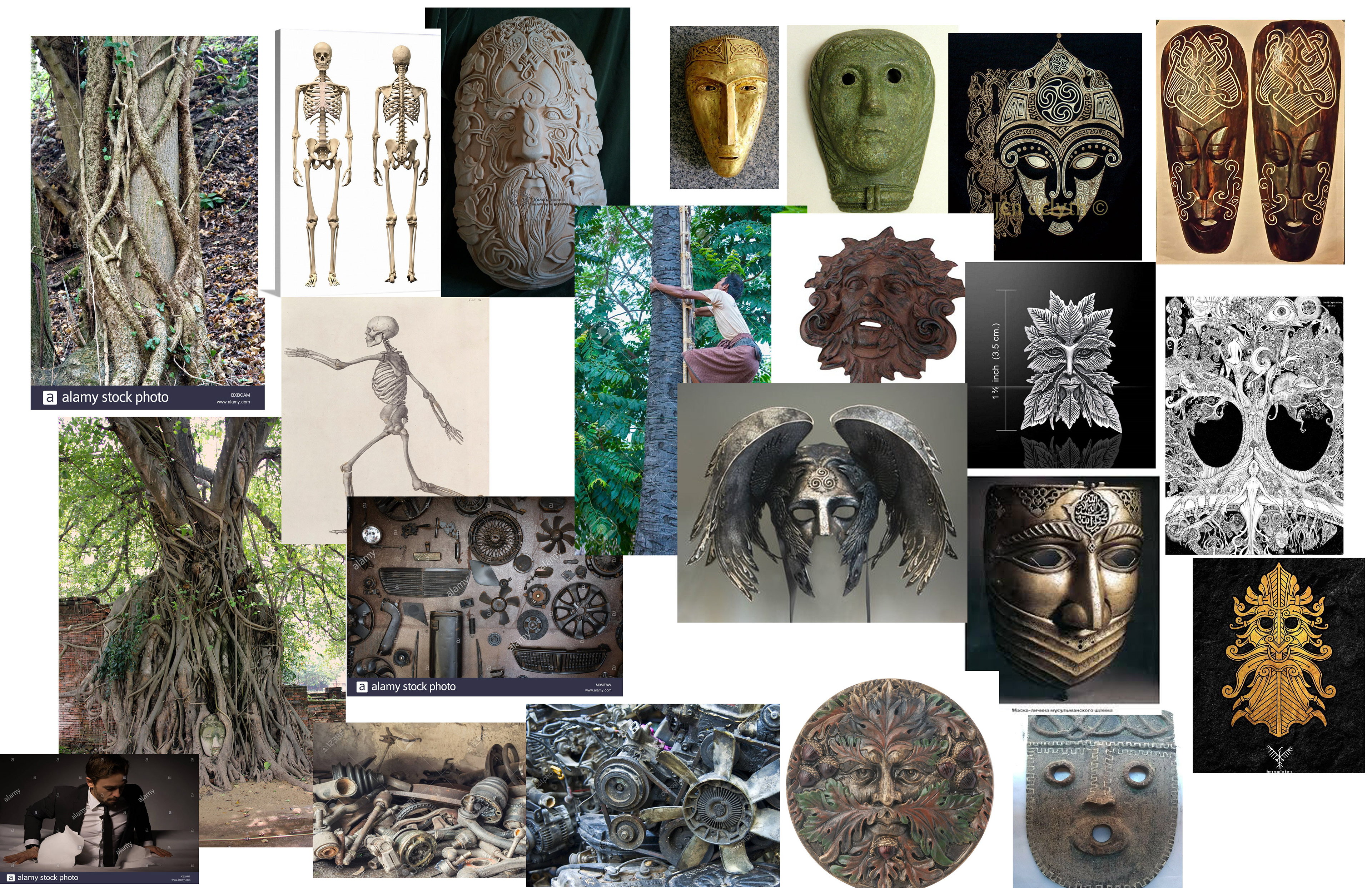 In the loose story outline, there was a young girl with freckles and a tangle of red hair that joined Alder at some point in his story. She is the one who named him and made the mask that he wears. I drew inspiration from Celtic masks and the tradition of the Green Man, this gave me examples of a neutral but benevolent face with decoration that would feel cohesive with his twisting form. I also wanted it to be a kind face, one that the girl would be comforted by and would fit her new friend.