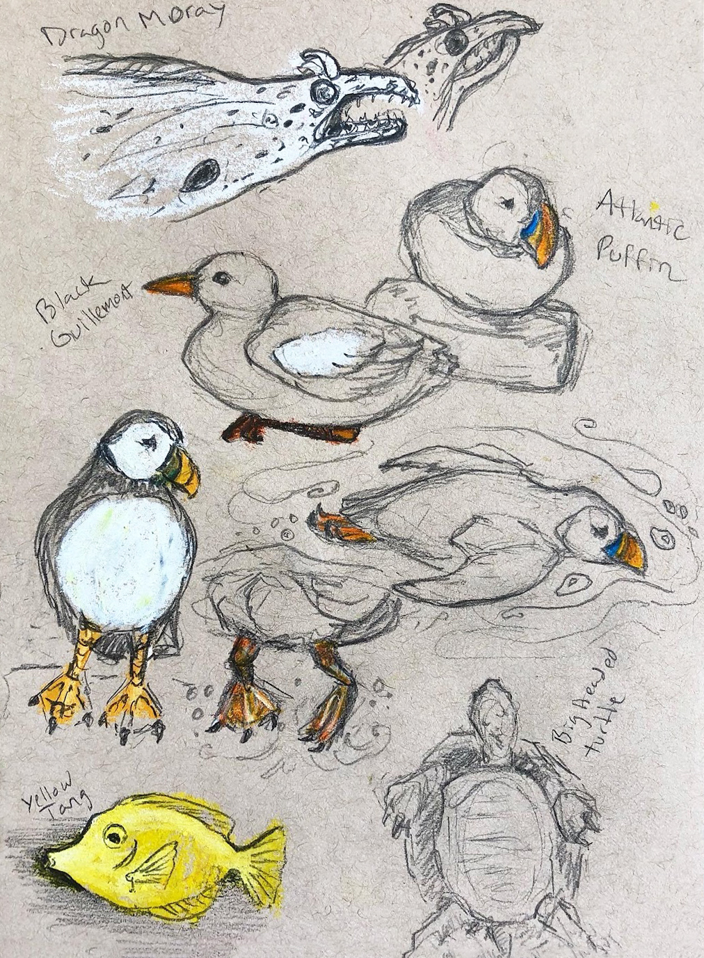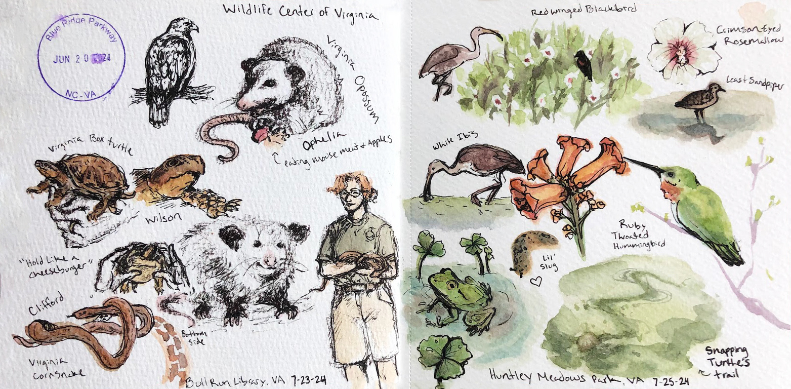 These are sketchbook pages I filled on trips to gardens, zoos, nature trails, theme parks, museums and more.