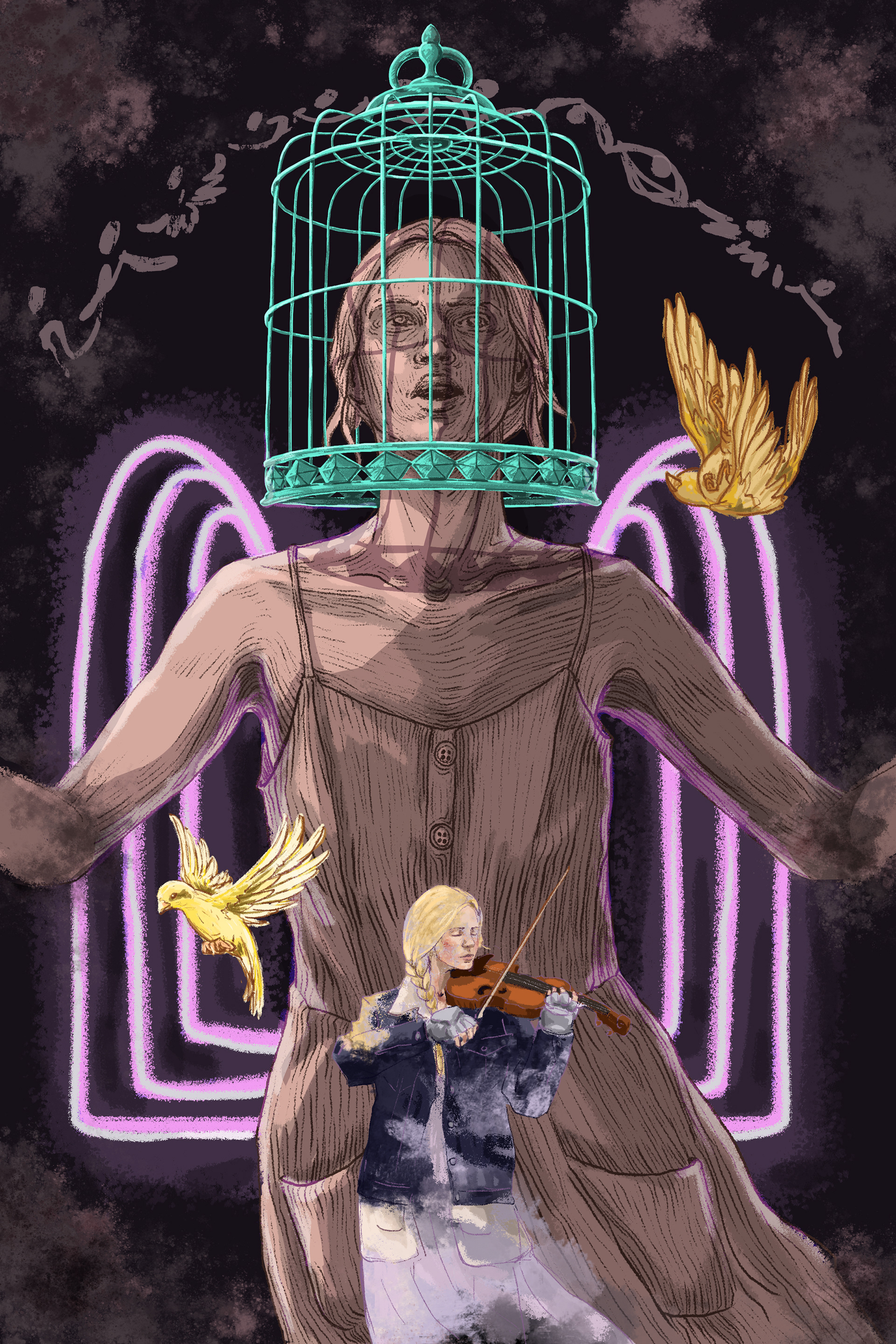 Once I had decided on the composition for the piece, I began with the two drawings of OA herself. The smaller figure is the younger version of OA, it is the moment she is playing her violin in the New York subway and the music catches the attention of Hap. She is the songbird, free and singing beautifully. She is colored closely to how she appeared in the scene- but I used an “oil” effect brush on top to muddle the colors a bit and give her the feel of a faded memory.
