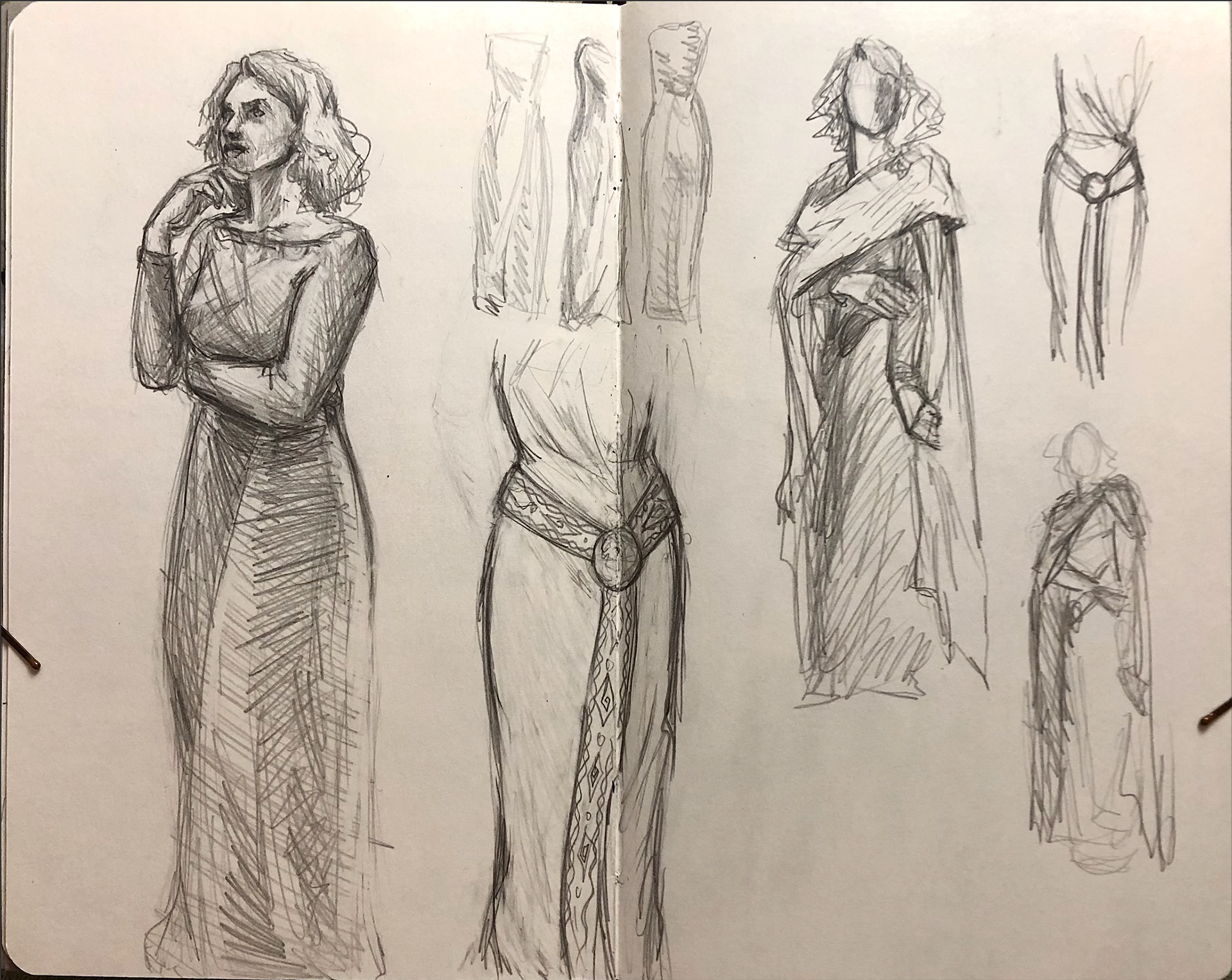 (bonus: Note the second sketchbook spread where I made four different sketches trying to imagine a way for the character to hide the wings under a cloak in an effort to blend in, then I remembered she had two sets of horns on her head that would make any blending in very difficult.)